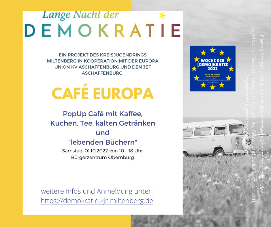 Wir werden am 01.10. von 10 – 18 Uhr ein Pop up Cafe anbieten. Wir haben verschiedene Gesprächspartner:innen eingeladen, die als sogenannte „lebende Bücher“ für einen Austausch zum Thema Europa zur Verfügung stehen. Wer genau das sein wird, ist auf unserer Homepage https://demokratie.kjr-miltenberg.de nachzulesen. Um 19 Uhr laden wir zu einer Improtheatershow der Tabutanten aus Aschaffenburg ein.